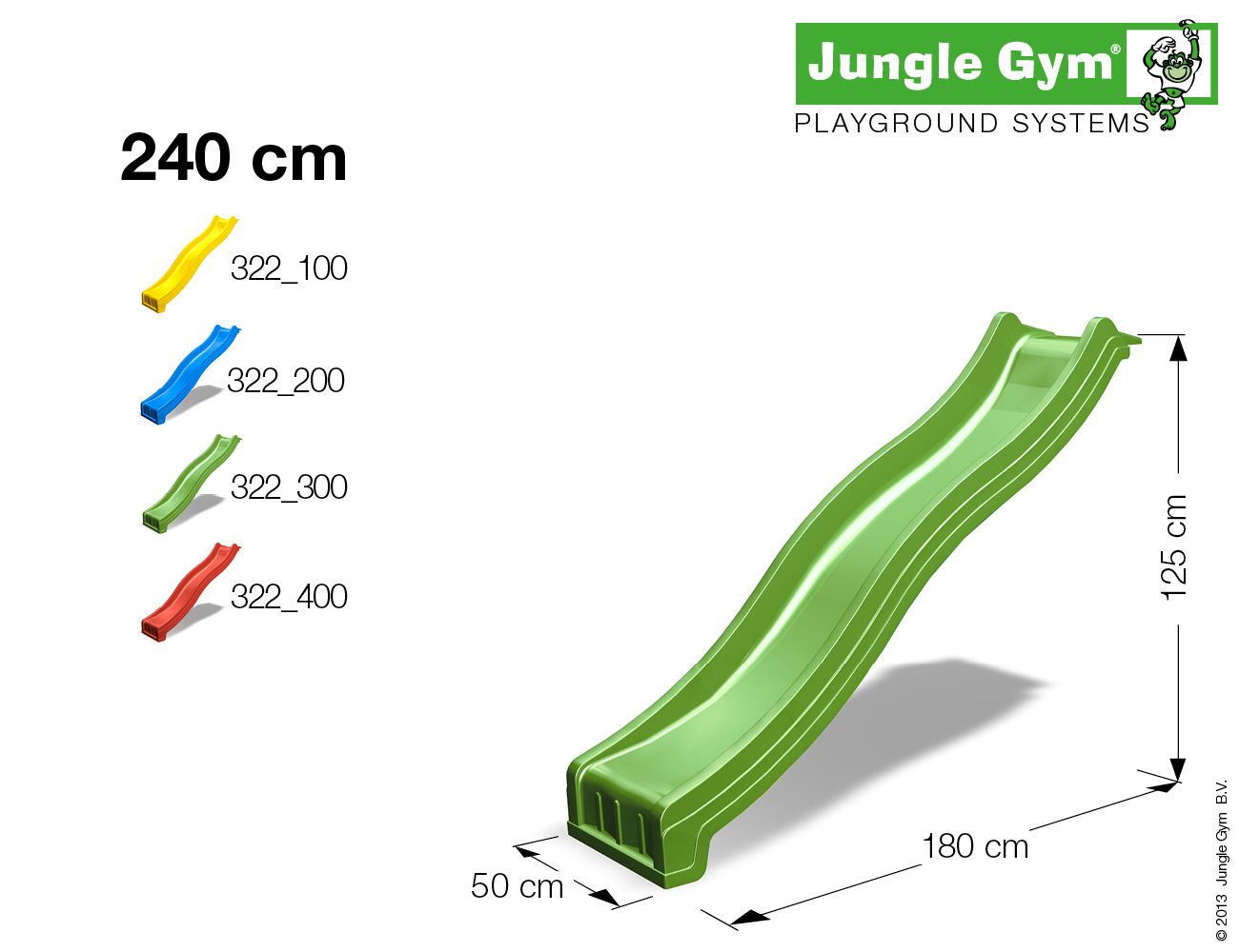 De 300cm glijbaan is speciaal ontworpen voor de grotere Jungle Gym speeltorens, zoals Jungle Palace of Jungle Barn. Perfect voor een grotere tuin.